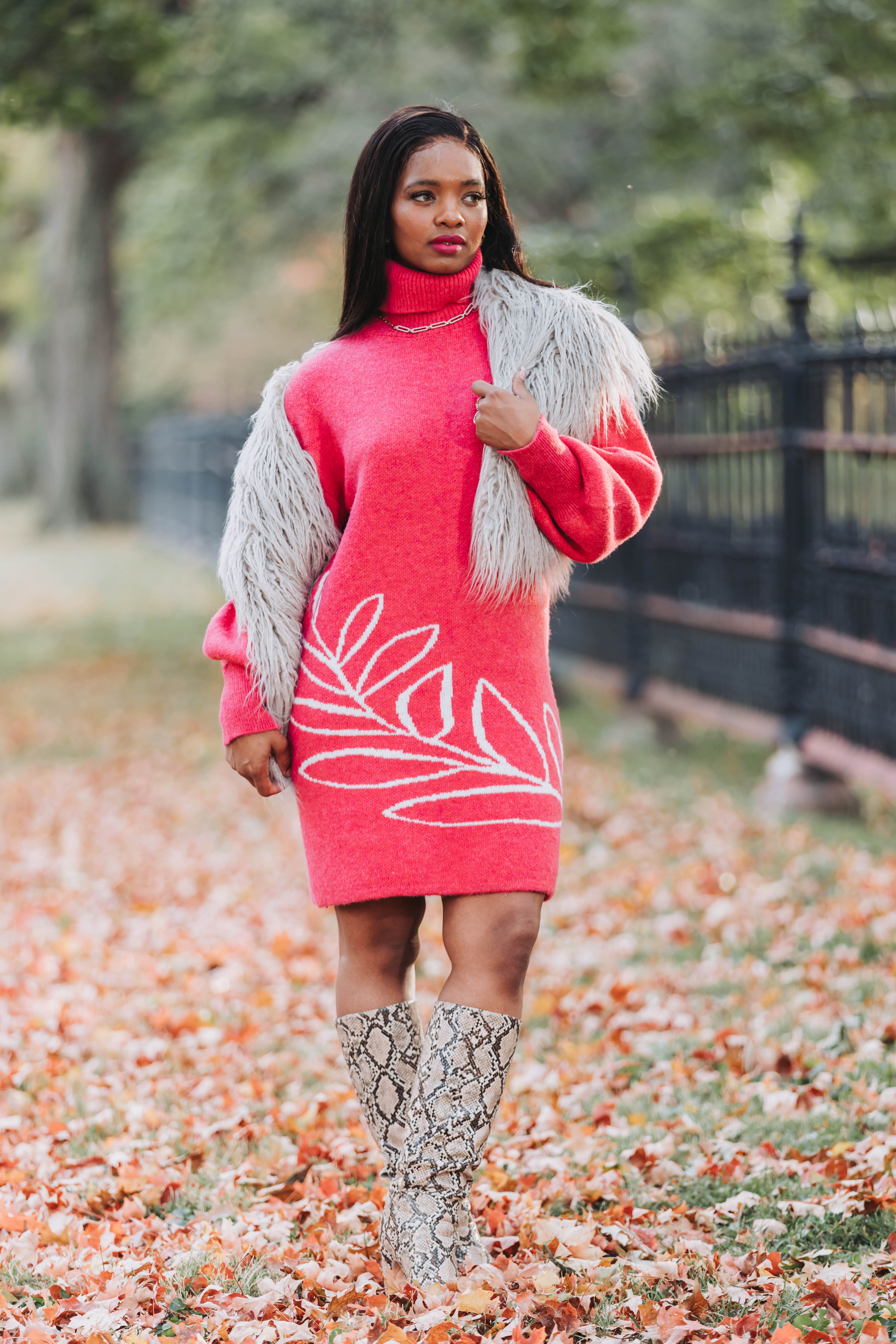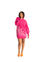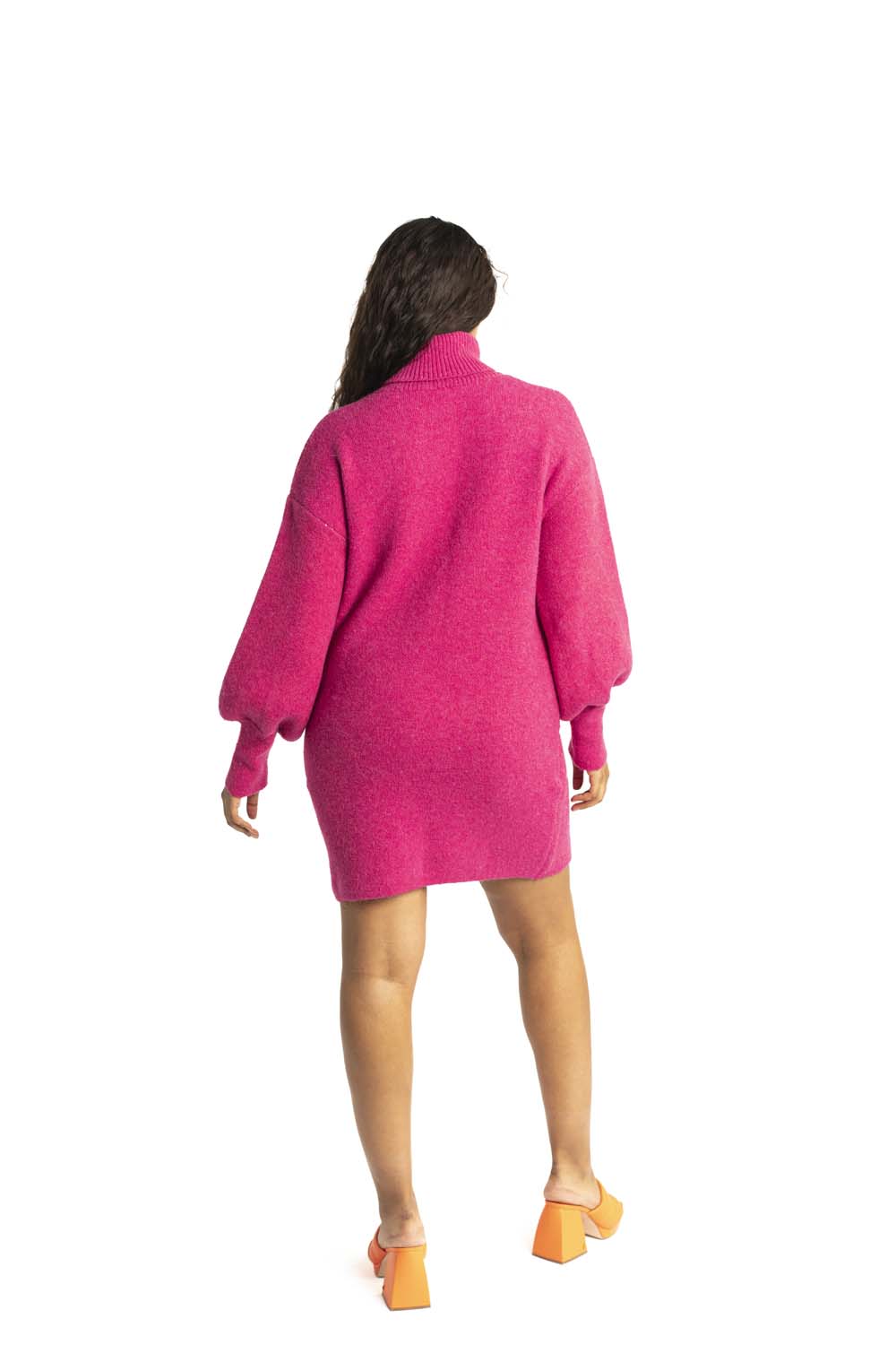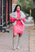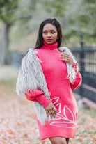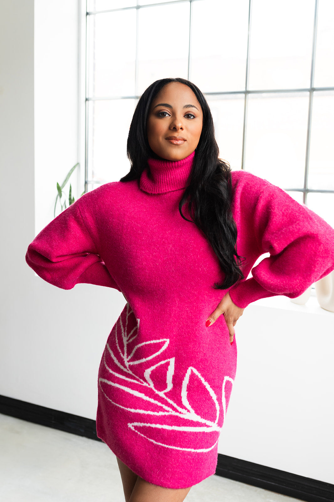 This Vine Motif Sweater Dress in shocking pink is Barbie's dream come true! Cozy up in this ribbed turtle neck in a sustainably sourced yarn blend while you show off the fun vine motif! Bishop sleeves and mini length make it date night-read when paired with sparkly booties and a chic moto jacket!, Or throw your hair under a baseball cap and rock the sneakers for a casual day time vibe - it's your call!